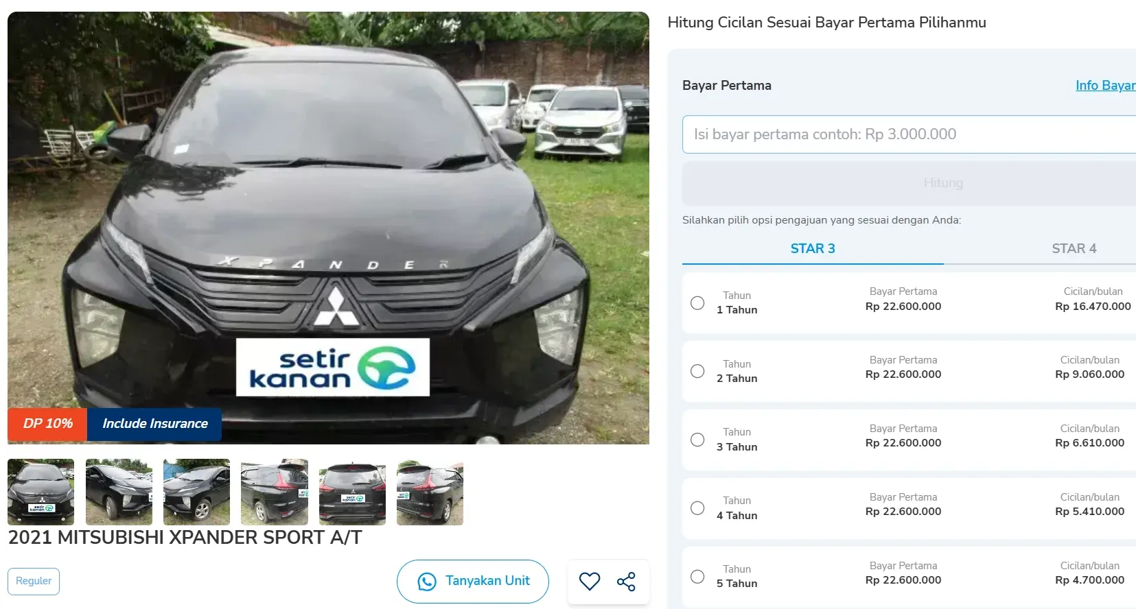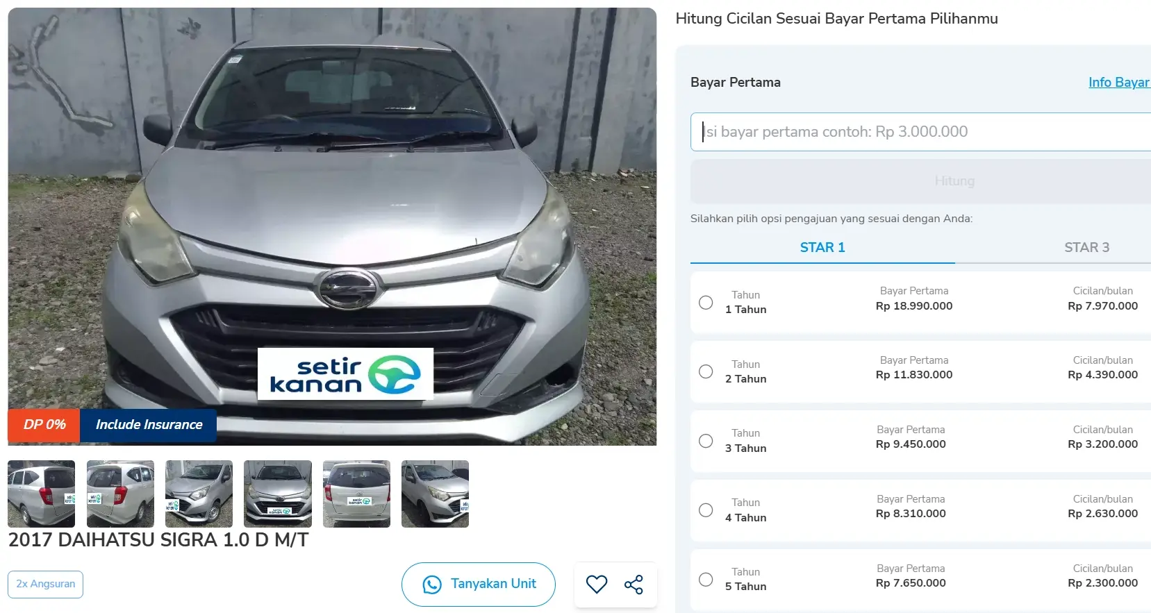 Setir Kanan merupakan platform yang menyediakan mobil bekas harga cerdas. Keuntungan membeli mobil bekas di Setir Kanan adalah DP 0%, cukup bayar 2x angsuran pertama (untuk unit bertanda khusus), dan cicilan mulai dari Rp 70 ribuan/hari saja!