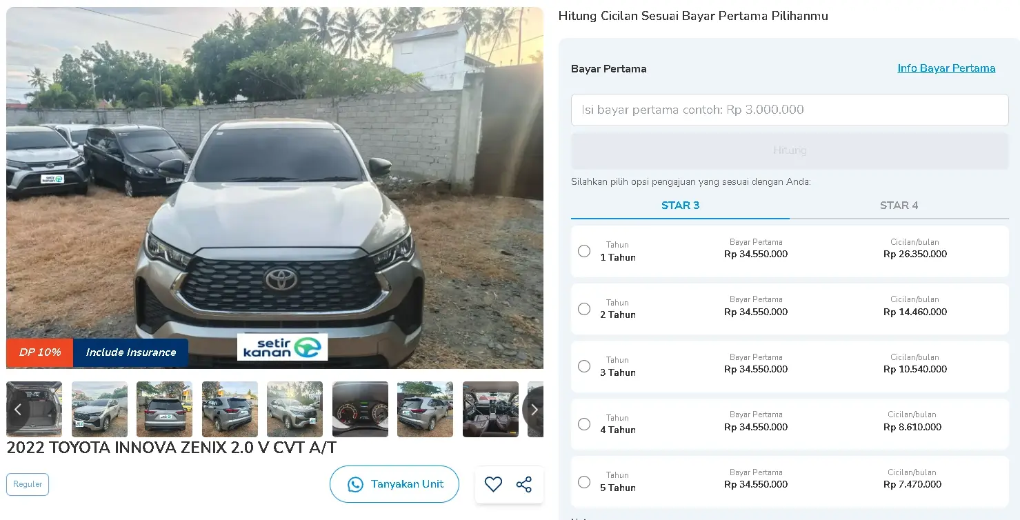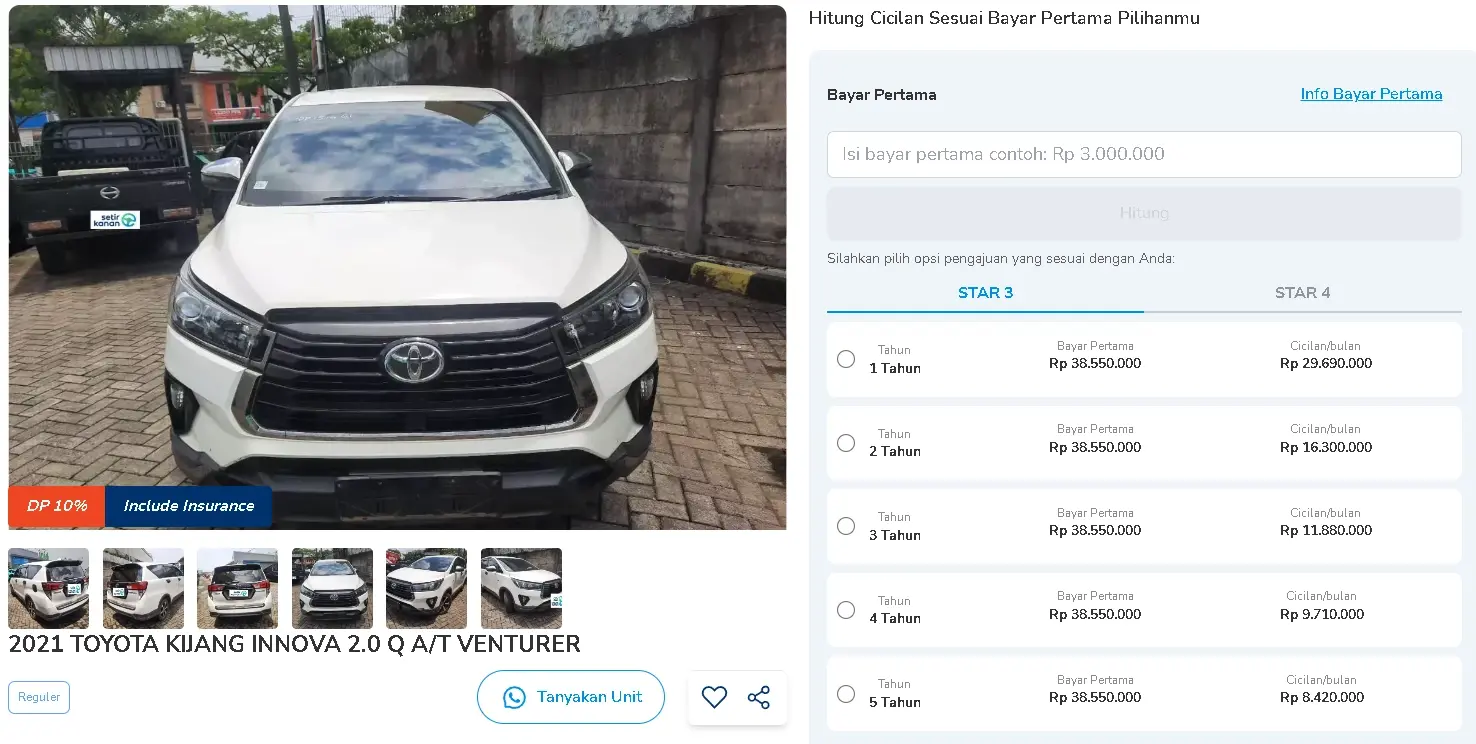 Unit berwarna putih ini bisa didapatkan dengan bayar pertama Rp 38.550.000 dengan skema DP 10% dan cicilan Rp 8.420.000 per bulan untuk tenor 5 tahun. Plat genap dan berlokasi di Makassar.