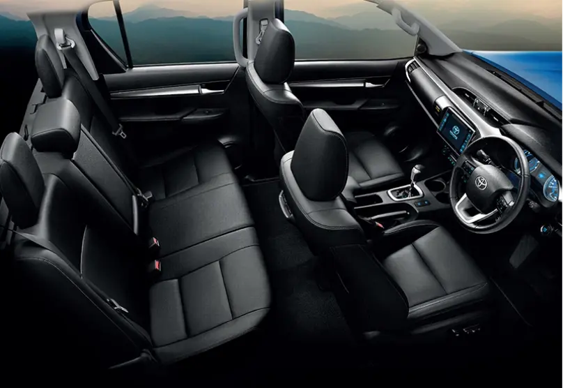 Meskipun dikenal sebagai “mobil pekerja keras”, interior Hilux tetap nyaman. Versi double cabin menawarkan kabin lapang, dashboard fungsional, head unit layar sentuh, sistem audio berkualitas, hingga kemudi ergonomis.