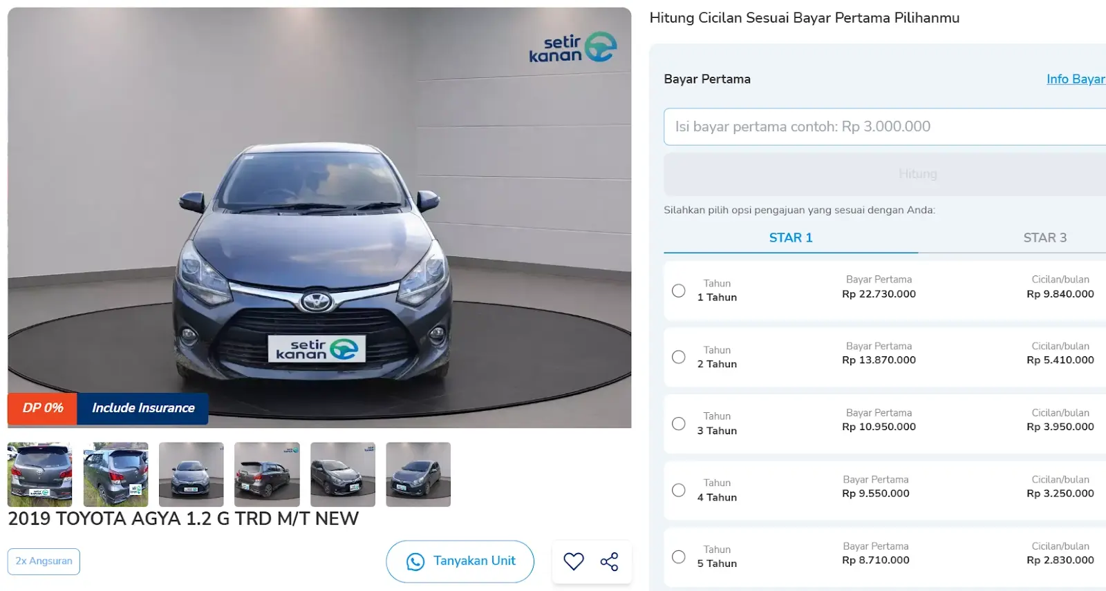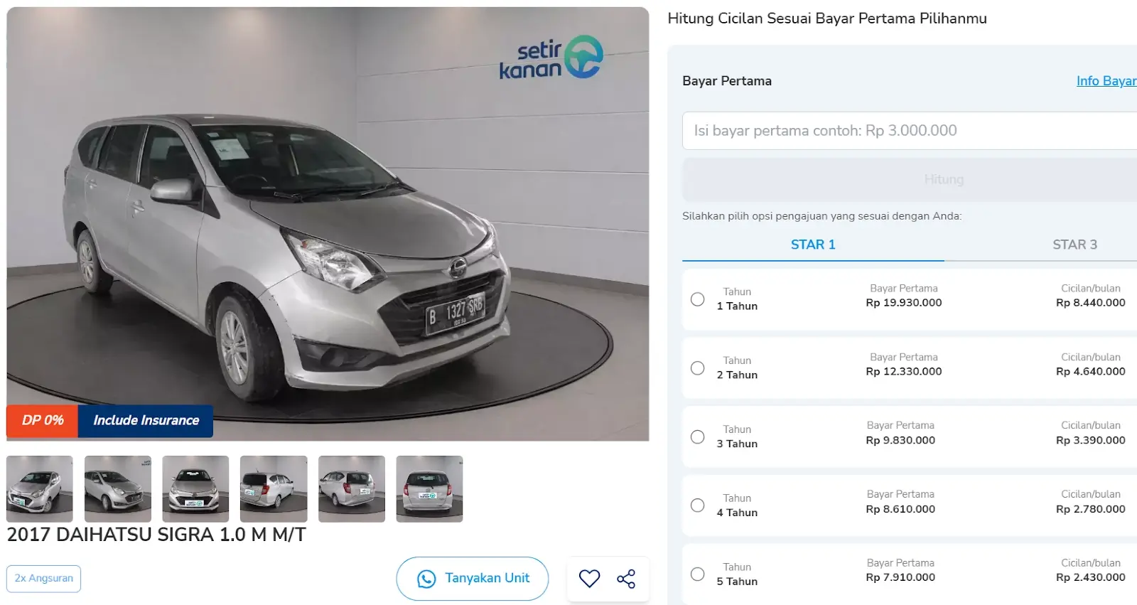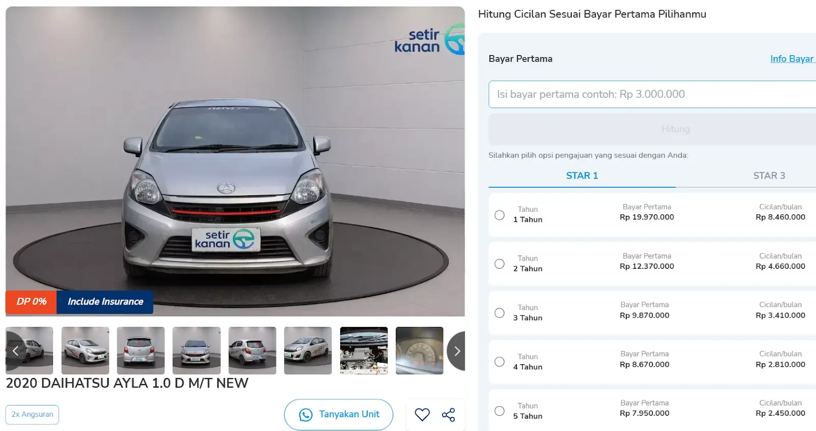 Di Setir Kanan, tersedia juga pembiayaan fleksibel dengan cicilan mulai Rp2 jutaan per bulan (sekitar Rp70 ribuan per hari) dan promo DP 0%, cukup bayar 2x angsuran di awal untuk unit bertanda khusus.