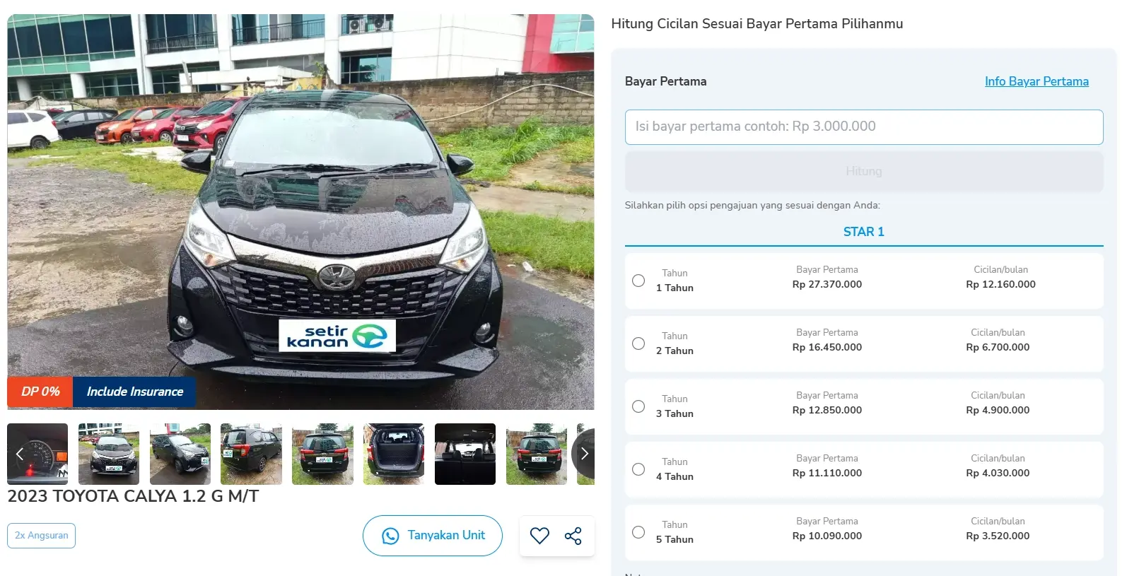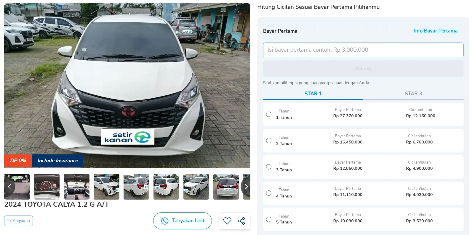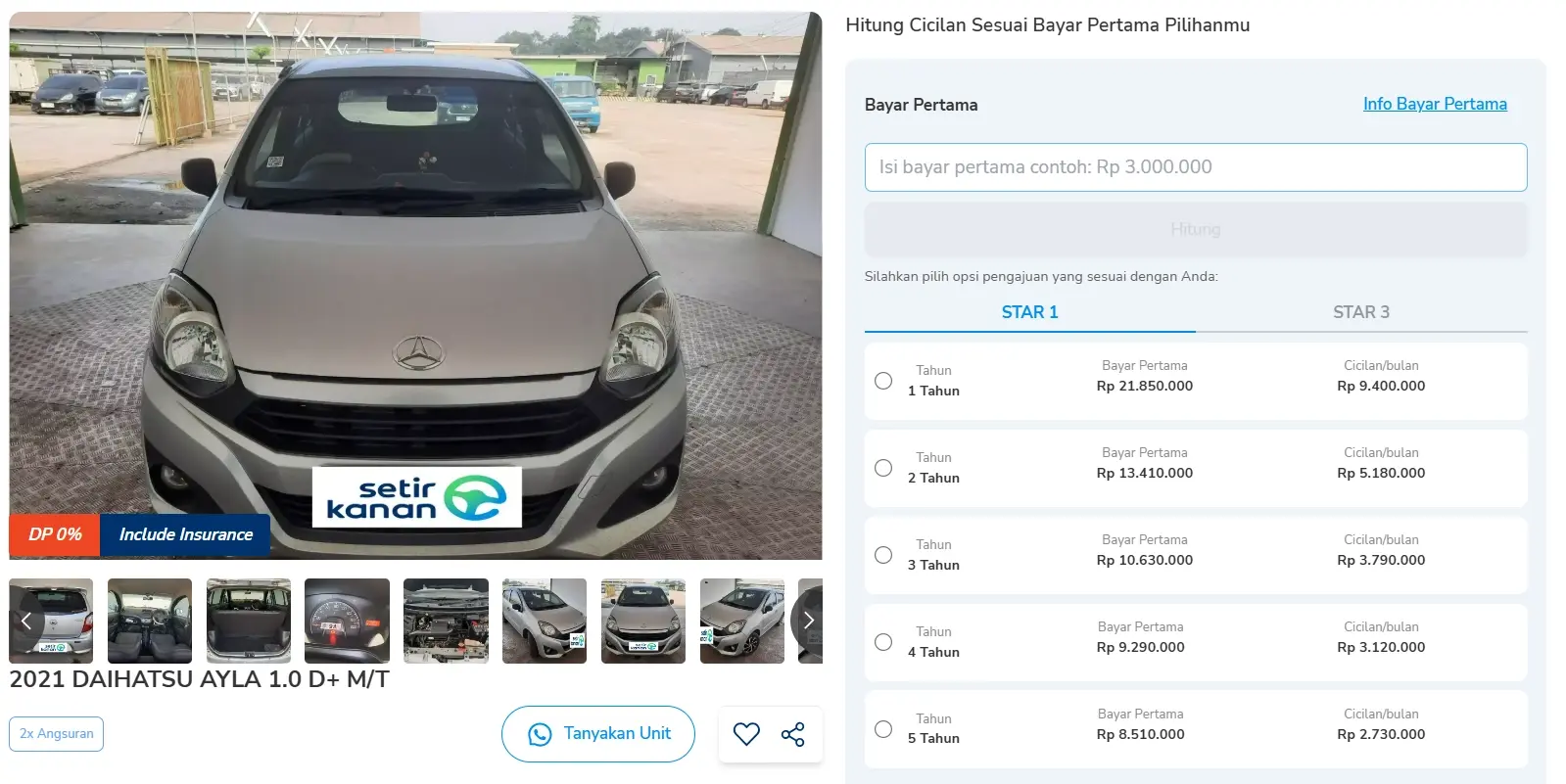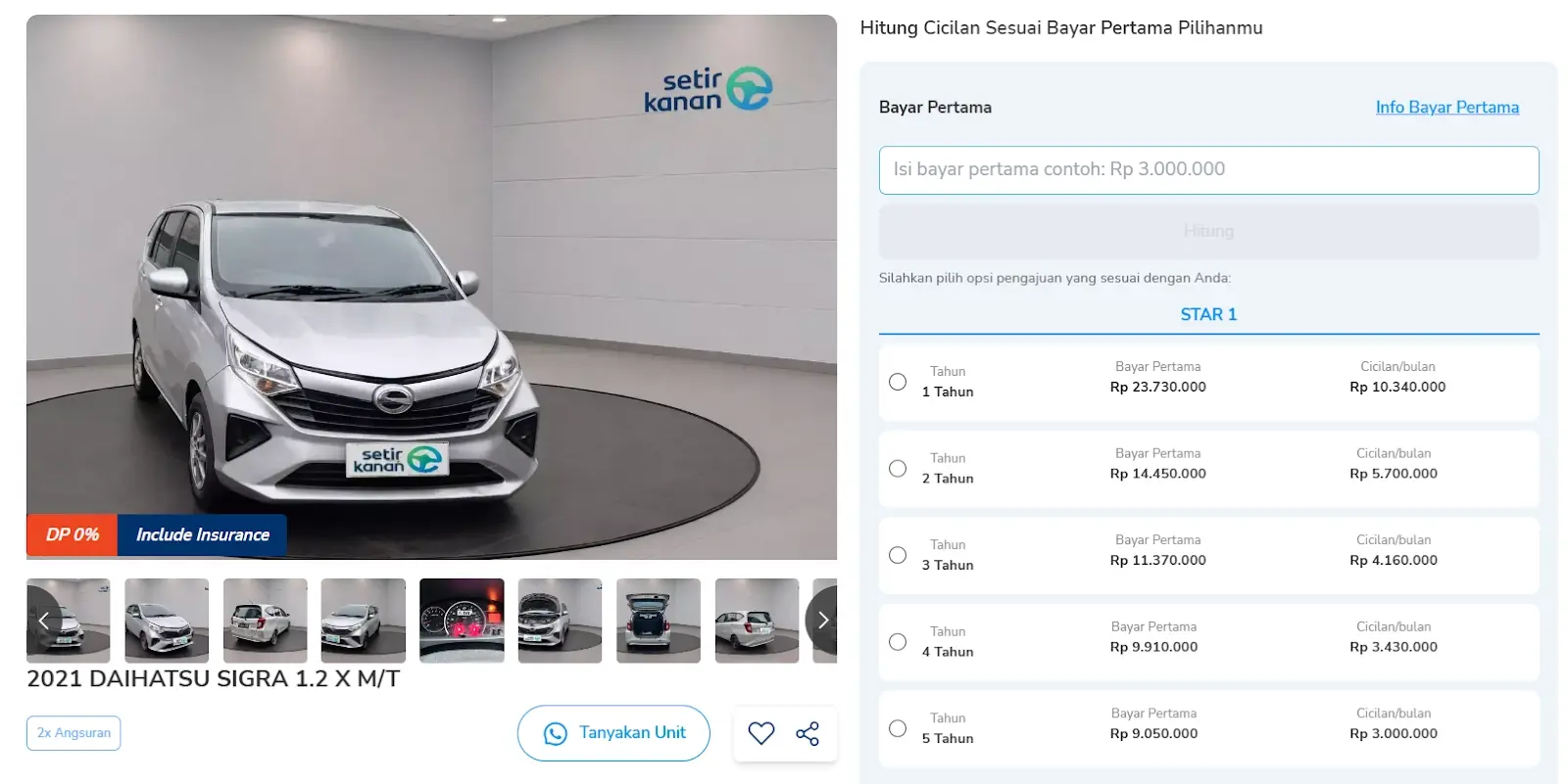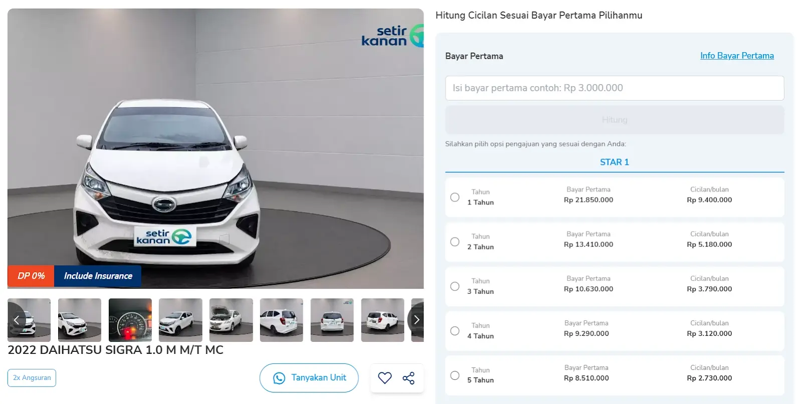 Di Setir Kanan, kamu bisa menemukan berbagai pilihan mobil bekas dengan opsi DP 0% untuk unit tertentu. Tinggal pilih unit mobil, lalu sesuaikan cicilan dengan kebutuhanmu.