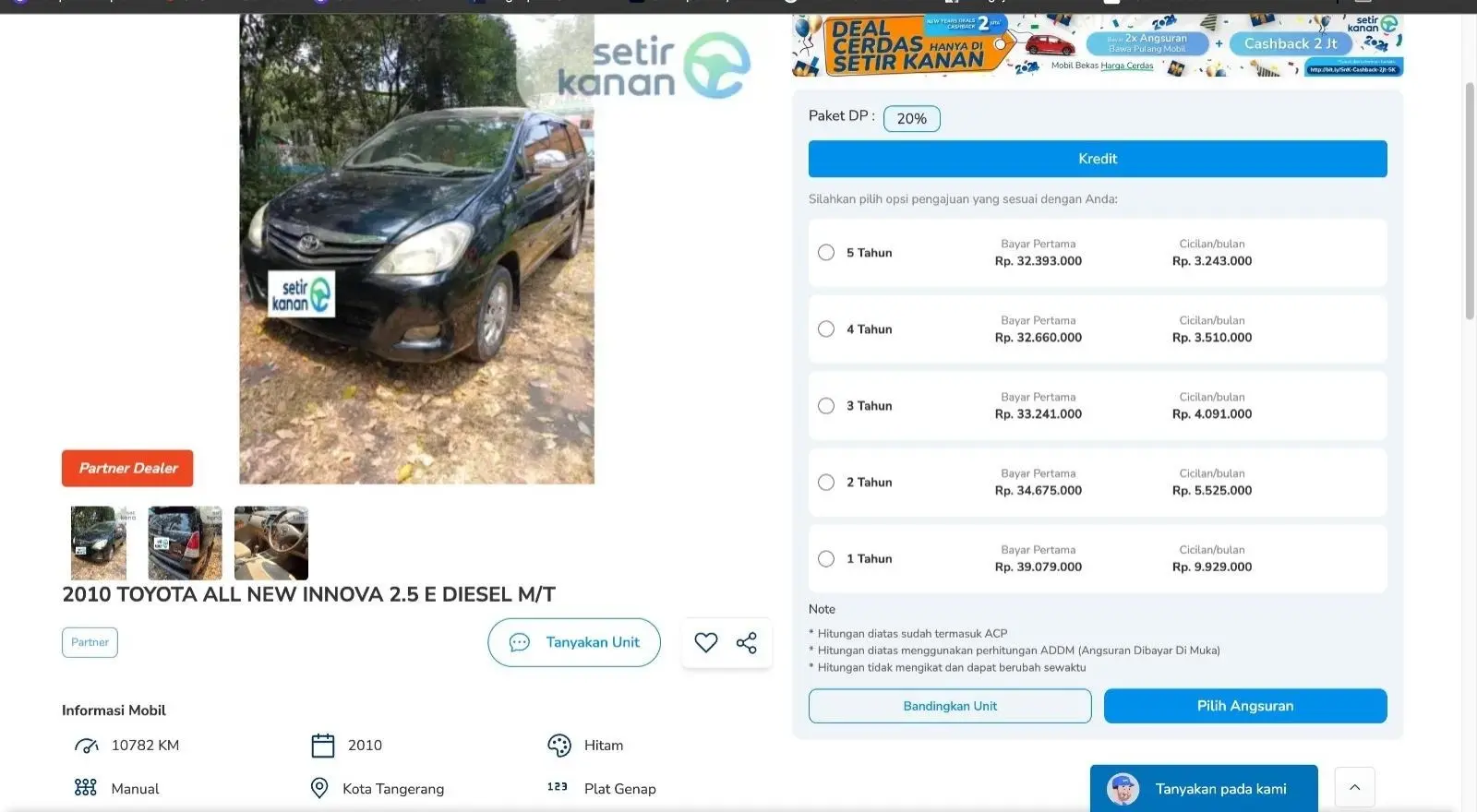 Apabila kamu ingin mencari mobil Toyota Innova 2.0 G MT 2023 bekas kamu bisa membelinya secara kredit, mulai dari Rp 7.962.000 per bulannya dengan tenor 5 tahun. Setir Kanan juga menyediakan tenor 1-5, sehingga bebas untuk memilih tenor yang sesuai dengan kemampuan finansial kamu.