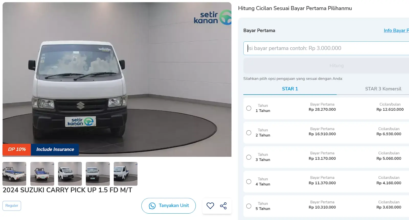 Tertarik? Lihat pilihan Suzuki Carry PU bekas di Setir Kanan atau langsung ajukan simulasi kredit dengan cicilan mulai 3 jutaan untuk tenor hingga 5 tahun.