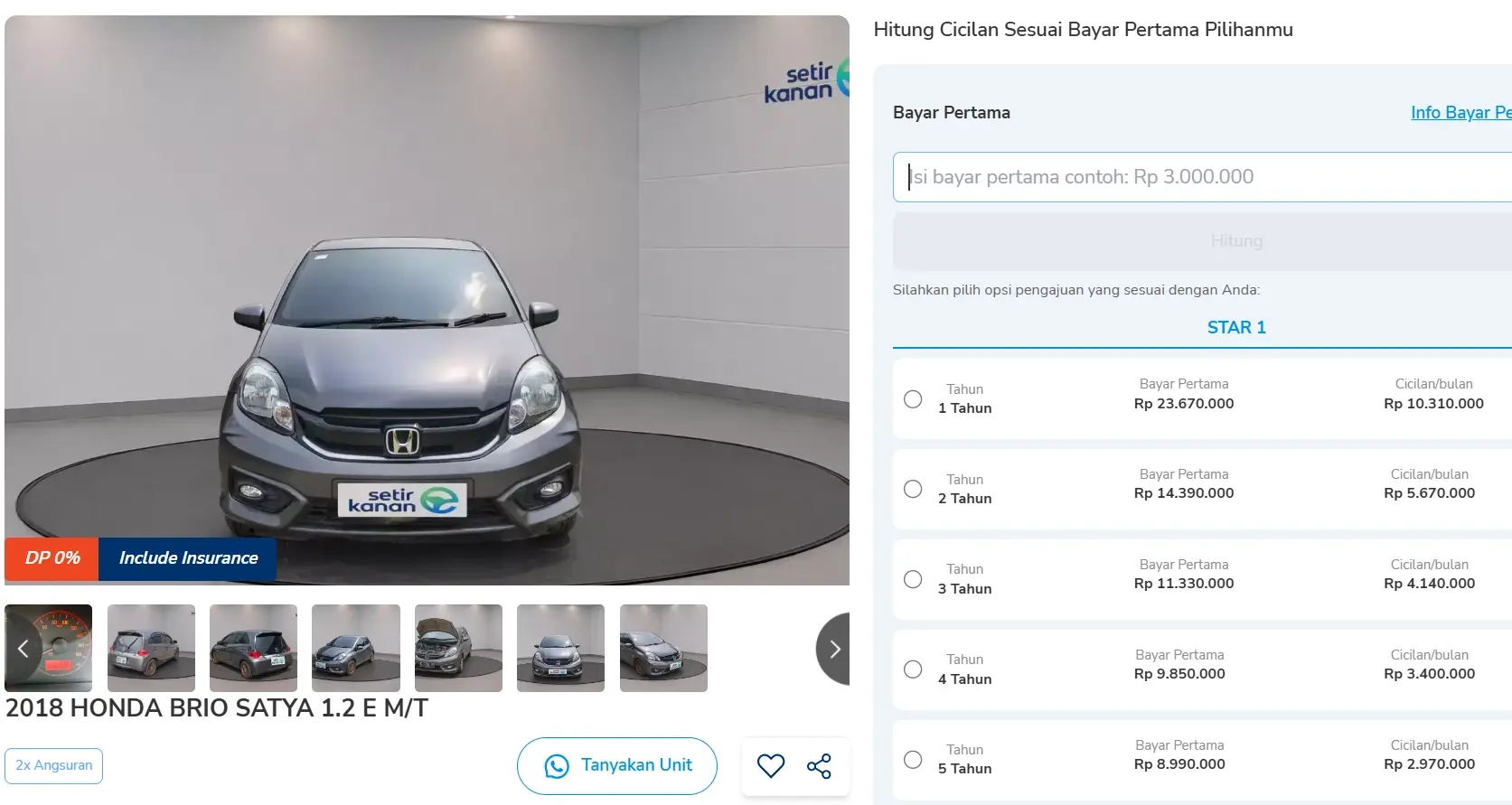 Apalagi lewat DP 0%, kamu bisa membawa pulang Brio ini dengan cicilan mulai 2 jutaan per bulan untuk tenor 5 tahun. Berikut simulasi kreditnya: