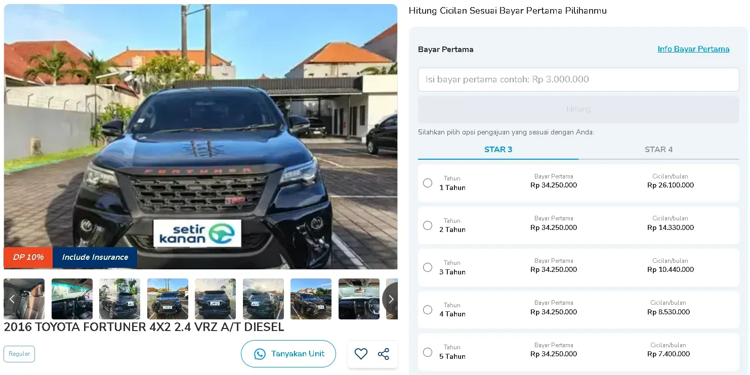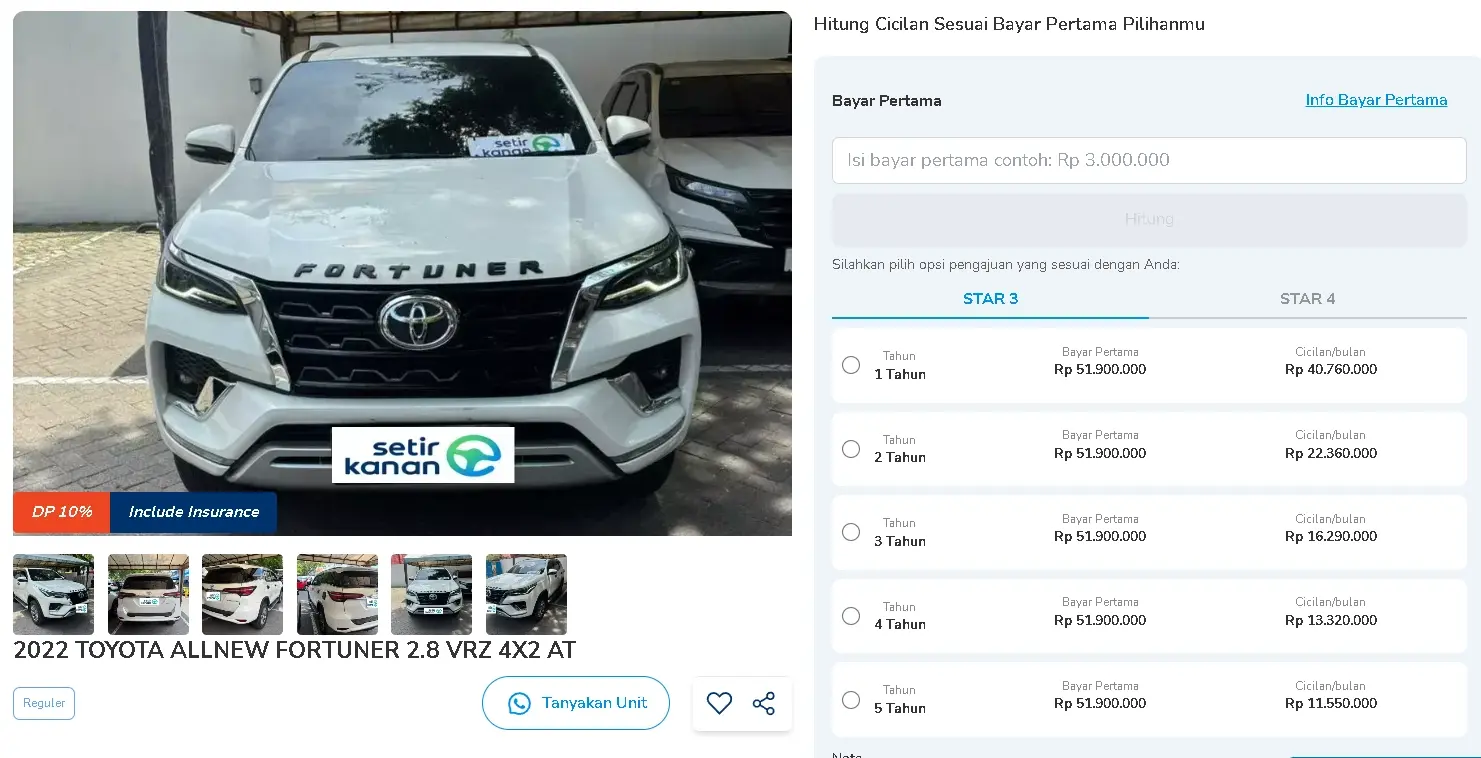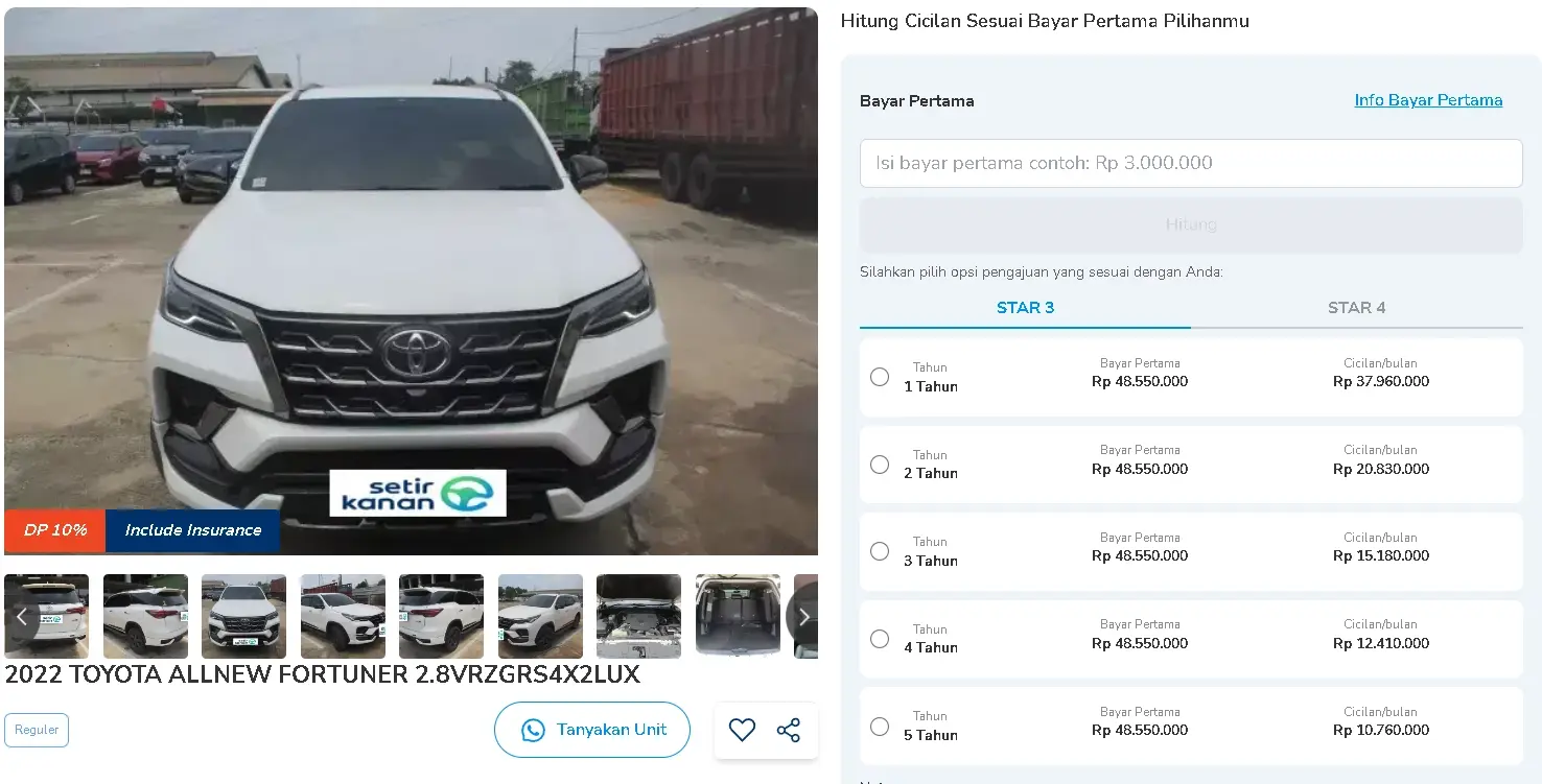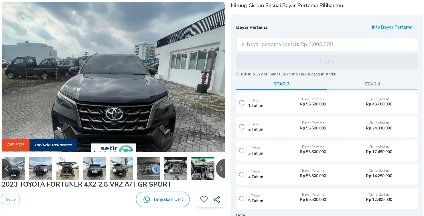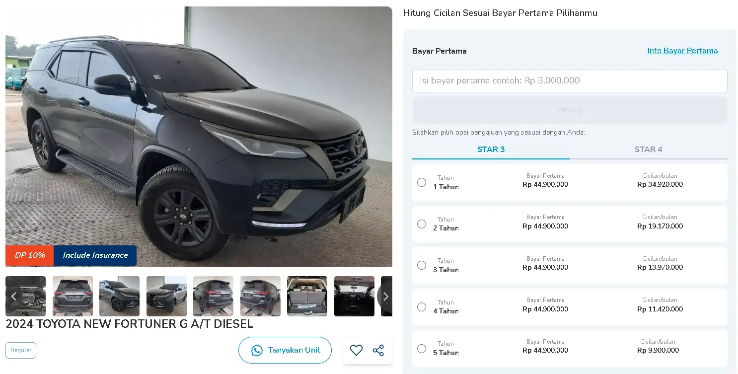 Fortuner ini hadir dalam warna hitam dengan transmisi otomatis dan berlokasi di Bogor. Untuk skema pembiayaan, cicilan mulai dari Rp9,9 jutaan per bulan dengan bayar pertama Rp44,9 juta untuk DP 10% dan tenor hingga 5 tahun.